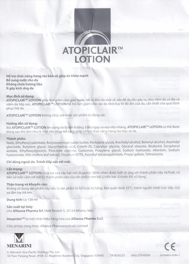 Sữa dưỡng ẩm Atopiclair Lotion Menarini giảm ngứa, rát, đau do viêm da cơ địa, viêm da tiếp xúc (120ml)Sữa dưỡng ẩm Atopiclair Lotion Menarini giảm ngứa, rát, đau do viêm da cơ địa, viêm da tiếp xúc (120ml)