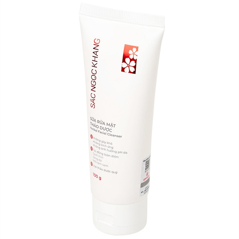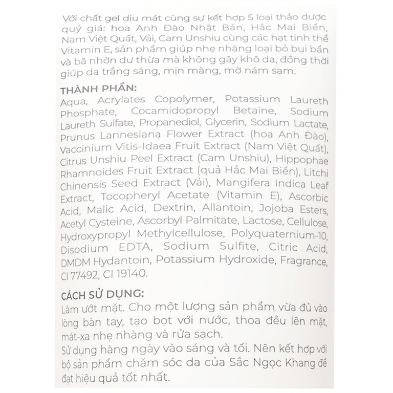 Sữa rửa mặt thảo dược Sắc Ngọc Khang với chất gel dịu mát cùng sự kết hợp 5 loại thảo dược quý giá: Hoa Anh Đào Nhật Bản, Hắc Mai Biển, Nam Việt Quất, Vải, Cam Unshiu cùng các hạt tinh thể Vitamin E, sản phẩm giúp nhẹ nhàng loại bỏ bụi bẩn và bã nhờn dư thừa mà không gây khô da, đồng thời giúp da trắng sáng, mịn màng, mờ nám sạm.