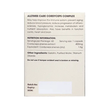 Thành phần cấu tạo (tính trong 1 viên nang cứng): Cao chiết xuất Đông trùng hạ thảo 400mg (Tương đương Đông trùng hạ thảo khô 1.5g)