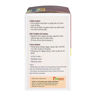 Viên uống Bình Vị Thái Minh là sản phẩm hỗ trợ sức khỏe dạ dày, được chiết xuất từ các thành phần thiên nhiên như Dạ cẩm, Lá khôi, và cây xương rồng. Bình Vị Thái Mình giúp giảm acid dịch vị, bảo vệ niêm mạc dạ dày, và cải thiện các triệu chứng viêm loét dạ dày như ợ chua và đau thượng vị.