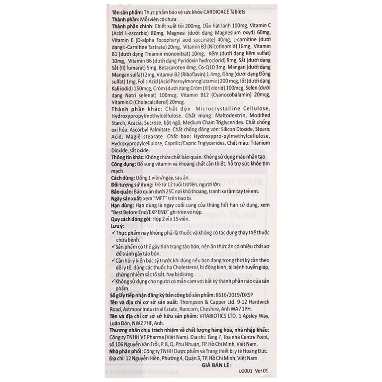 Vitabiotics Cardioace bổ sung vitamin và khoáng chất cần thiết, hỗ trợ sức khỏe tim mạch.