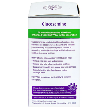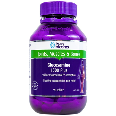 Thực phẩm bảo vệ sức khỏe Henry Blooms Glucosamine 1500 Plus cung cấp các hoạt chất như Glucosamine hydrochloride, Chondroitin Sulfate, Boron, Mangan và chiết xuất tiêu đen, có công dụng hỗ trợ tiết dịch khớp, bảo vệ màng sụn khớp, giúp khớp vận động linh hoạt và giảm nguy cơ thoái hóa khớp.