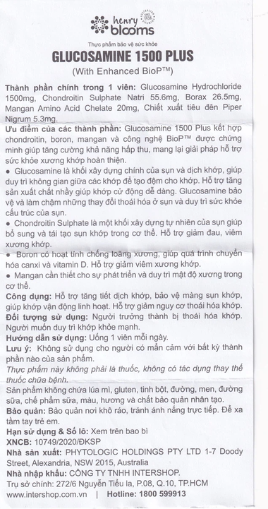 Thực phẩm bảo vệ sức khỏe Henry Blooms Glucosamine 1500 Plus không phải là thuốc và không có tác dụng thay thế thuốc chữa bệnh.