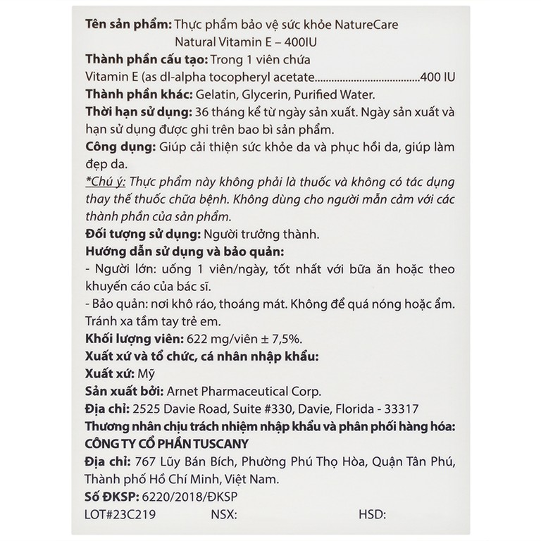 Thực phẩm bảo vệ sức khỏe Natural Vitamin E 400 IU NatureCare giúp cải thiện sức khỏe da và phục hồi da, giúp làm đẹp da.
