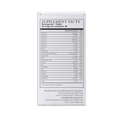 | Vitamin A (dạng Retinyl acetate & Beta Carotene), Vitamin C (dạng acid Ascorbic), Vitamin D (dạng Cholecalciferol), Vitamin E (dl-Alpha Tocophenyl Acetate), Vitamin K (dạng Phytonadione), Vitamin B1 (dạng Thiamine Mononitrate), Vitamin B2 (dạng Riboflavin), Niacin (dạng Niaciamide), Vitamin B6 (dạng Pyridoxine Hydrochloride), Acid folic, Vitamin B12 (dạng Cyanocobalamin), Biotin, Acid Pantothenic (dạng D-Calcium Pantothenate), Canxi (dạng calcium Carbonate), Sắt (dạng Ferrous Fumarae), Magie (dạng Oxit magie), Kẽm (dạng Oxit kẽm), Selen (dạng Selen natri), Đồng (dạng Oxit đồng), Mangan (dạng Mangan sulfat), Crôm (dạng Crôm clorua), Lutein (Chiết xuất từ bông cúc vàng) |