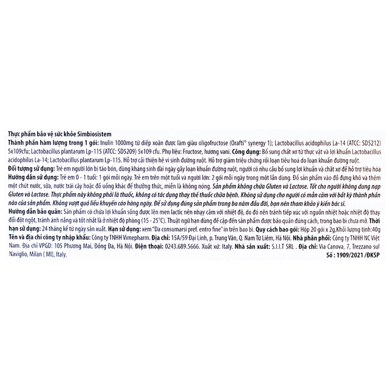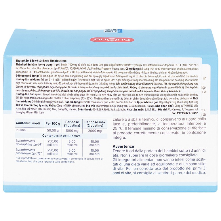 Buona Simbiosistem Bustine bổ sung chất xơ từ thực vật và lợi khuẩn Lactobacillus acidophilus La-14; Lactobacillus plantarum Lp-115.