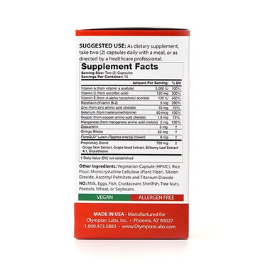 Viên uống hỗ trợ thị lực chứa Vitamin A (5000IU), C (120mg), E (120IU), kẽm, selenium, Lutein (6mg), Zeaxanthin (5mg), chiết xuất bạch quả (20mg) và hỗn hợp 750mg (vỏ nho, hạt nhỏ, lá việt quất, Glutathione), giúp cải thiện thị lực, bảo vệ mắt khỏe mạnh. Phù hợp cho người muốn duy trì đôi mắt sáng rõ, chỉ cần 2 viên/ngày cùng bữa ăn.