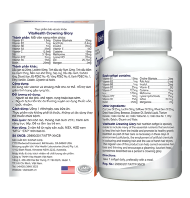 VitaHealth Crowning Glory bổ sung các vitamin và khoáng chất cho cơ thể, hỗ trợ làm giảm tình trạng gãy rụng tóc.