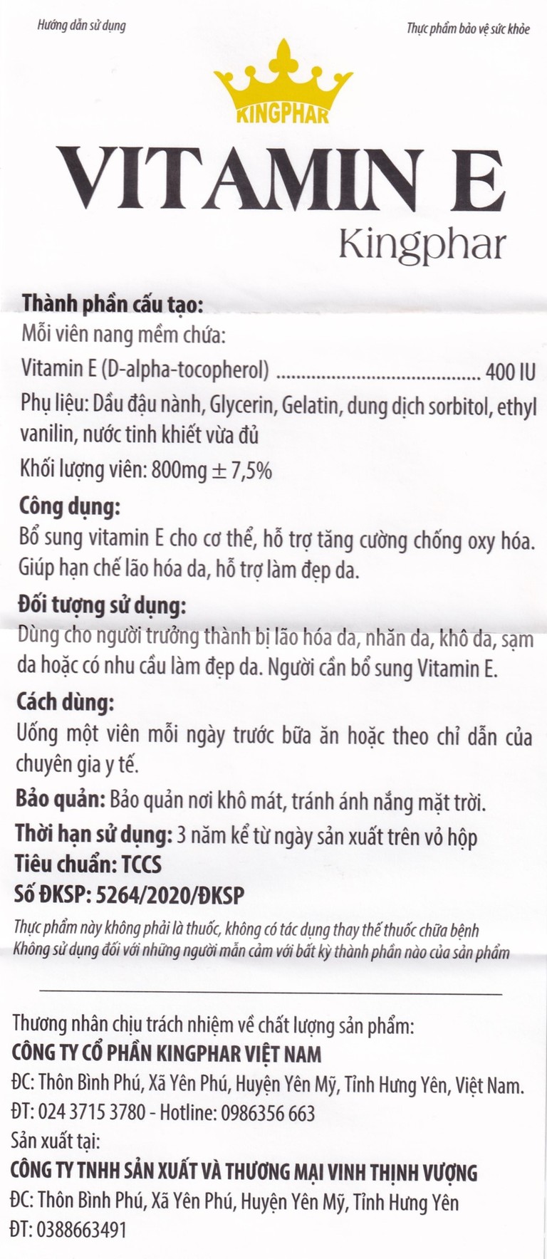 Thành phần của Thực phẩm bảo vệ sức khỏe Vitamin E Kingphar