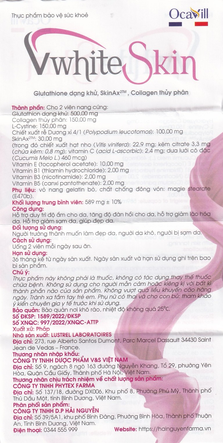 Thực phẩm bảo vệ sức khỏe VwhiteSkin hỗ trợ duy trì độ ẩm cho da, hỗ trợ tăng độ đàn hồi cho da, hỗ trợ giảm lão hóa da.