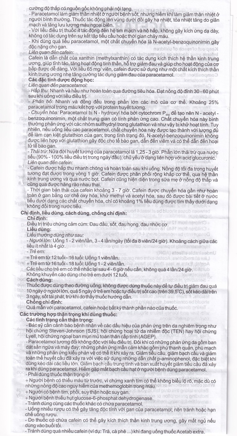Với liều 65 mg viên, cafein được sử dụng như một chất kích thích thần kinh trung lượng nhẹ tăng cường tác dụng giảm đau của paracetamol.