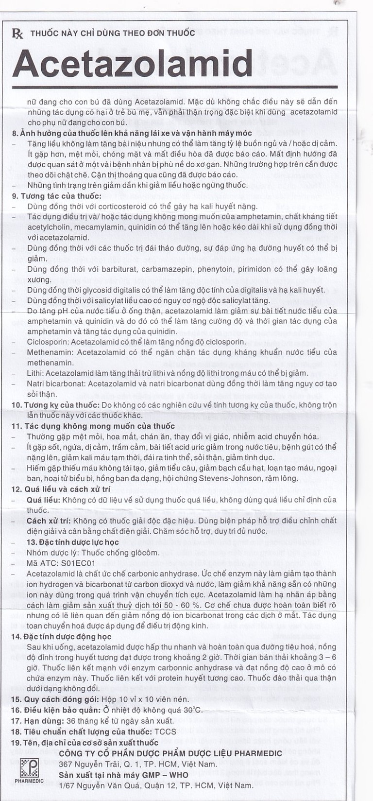 Thuốc Acetazolamid 250mg Pharmedic điều trị glôcôm và động kinh nhẹ (10 vỉ x 10 viên)