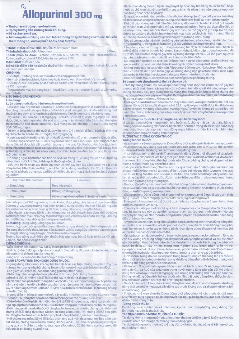 (Viên Allopurinol 300 mg là dạng thuốc không được phép chia liều nhỏ hơn đơn vị liều 300mg. Vì vậy, trong trường hợp bệnh nhân sử dụng các liều khác với liều 300mg, cần hỏi ý kiến của bác sĩ hoặc dược sĩ để được hướng dẫn dạng dùng thích hợp).