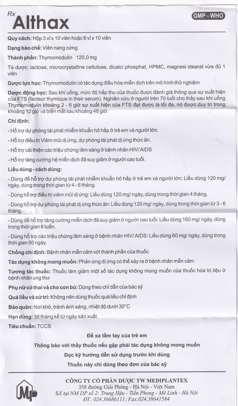 Thuốc Althax 120mg Mediplantex hỗ trợ điều trị viêm mũi dị ứng, nhiễm khuẩn hô hấp (3 vỉ x 10 viên)