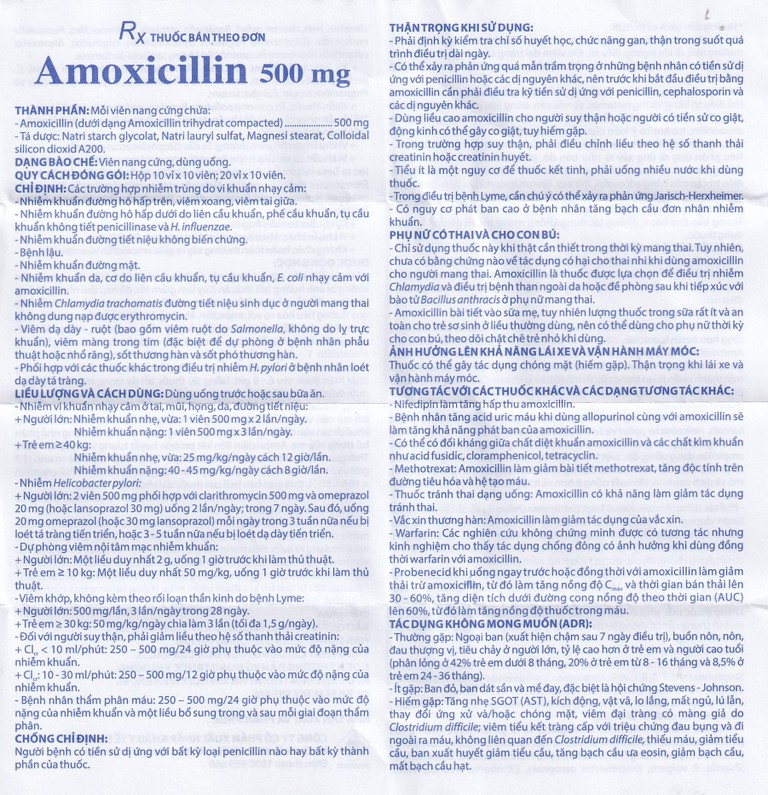 Nhiễm Helicobacter pylori: Người lớn: 2 viên 500 mg phối hợp với clarithromycin 500 mg và omeprazol 20 mg (hoặc lansoprazoi 30 mg) uống 2 lần/ngày; trong 7 ngày. Sau đó, uổng 20 mg omeprazol (hoặc 30 mg lansoprazol) mỗi ngày trong 3 tuần nữa nếu bị loét tá tràng tiến triển, hoặc 3 – 5 tuần nữa nếu bị loét dạ dày tiến triển.