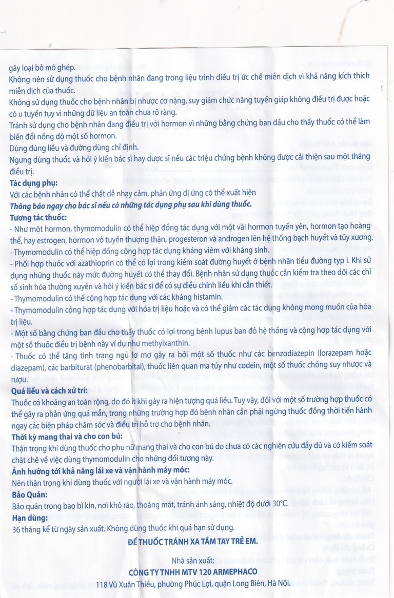 Không có bằng chứng cho thấy Thymomodulin có tác động lên khả năng lái xe và vận hành máy móc của bệnh nhân.