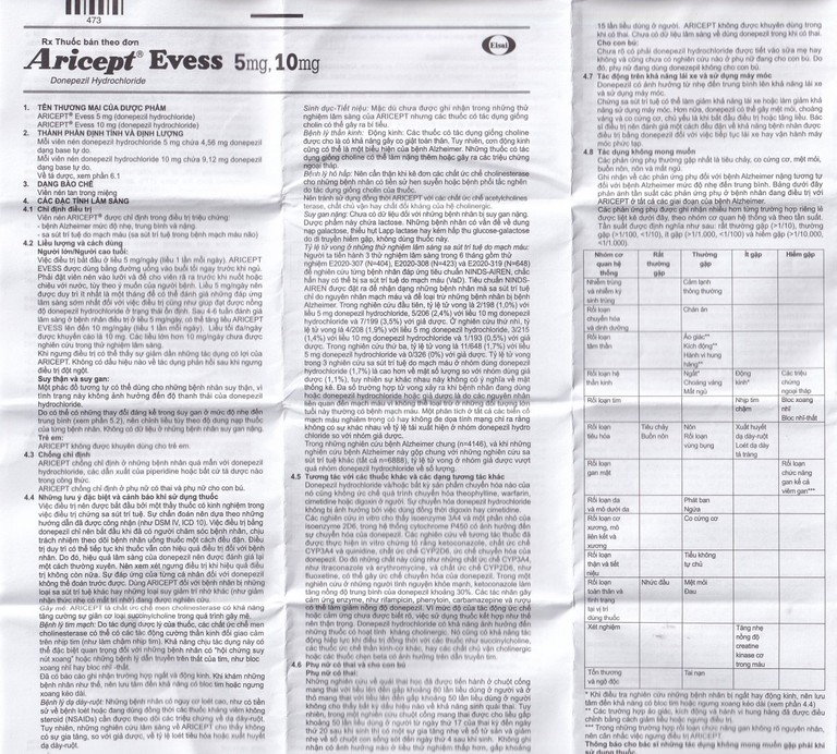 Các phản ứng phụ thường gặp nhất là tiêu chảy, co cứng cơ, mệt mỏi, buồn nôn, nôn và mất ngủ. Ghi nhận về các phản ứng phụ đối với bệnh Alzheimer nặng tương tự đối với bệnh Alzheimer mức độ nhẹ đến trung bình. Bảng dưới đây phản ánh tần suất các phản ứng phụ ở bệnh nhân đang điều trị với Aricept Evess 5Mg ở tất cả các giai đoạn của bệnh Alzheimer.