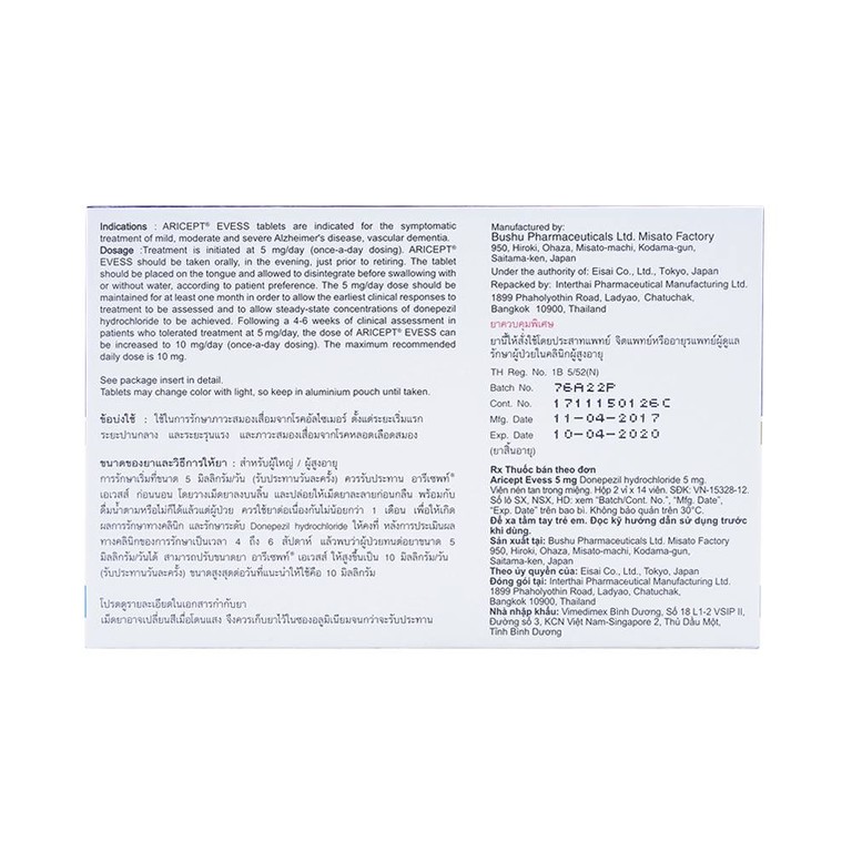 Vì vậy Aricept Evess 5Mg không được xem là có bất kỳ tác động nào trên tiến triển của bệnh. Hiệu quả của việc điều trị chứng sa sút trí tuệ trong bệnh Alzheimer bằng Aricept Evess 5Mg đã được nghiên cứu trong 4 thử nghiệm lâm sàng có kiểm chứng bằng giả dược, 2 thử nghiệm kéo dài 6 tháng và 2 thử nghiệm kéo dài 1 năm. Aricept Evess 5Mg đã tạo ra sự tăng đáng kể có ý nghĩa thống kê phụ thuộc vào liều với số phần trăm các bệnh nhân được đánh giá là đáp ứng điều trị.