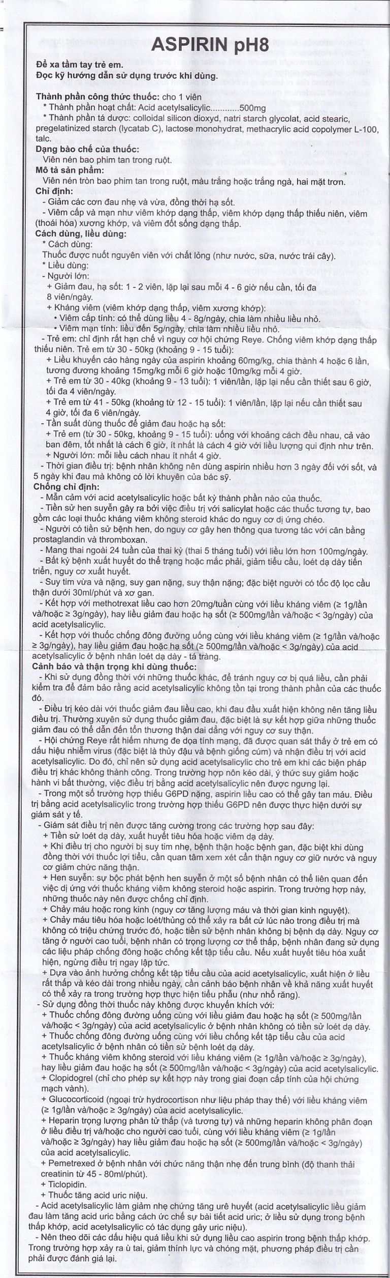 Thải trừ: Aspirin được bài tiết dưới dạng acid salicylic, các hợp chất glucuronid, acid gentisic. Tỷ lệ bài tiết aspirin thay đổi theo pH của nước tiểu, tăng khi pH tăng và lớn nhất ở pH 7,6 trở lên.