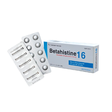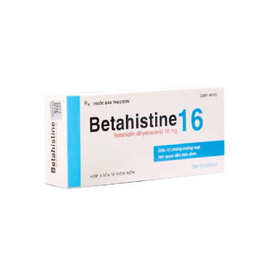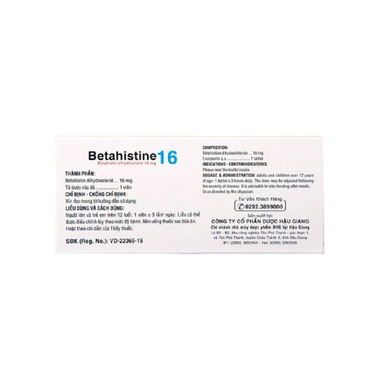 Betahistine 16mg dạng viên nén chứa hoạt chất Betahistin Dihydroclorid được sản xuất bởi Công ty Cổ phần Dược Hậu Giang. Betahistine điều trị chứng chóng mặt liên quan đến tiền đình, hội chứng Ménière: Chóng mặt, ù tai, nôn ói, nhức đầu và đôi khi kèm theo mất thính lựcDược lực học