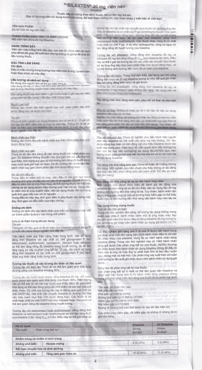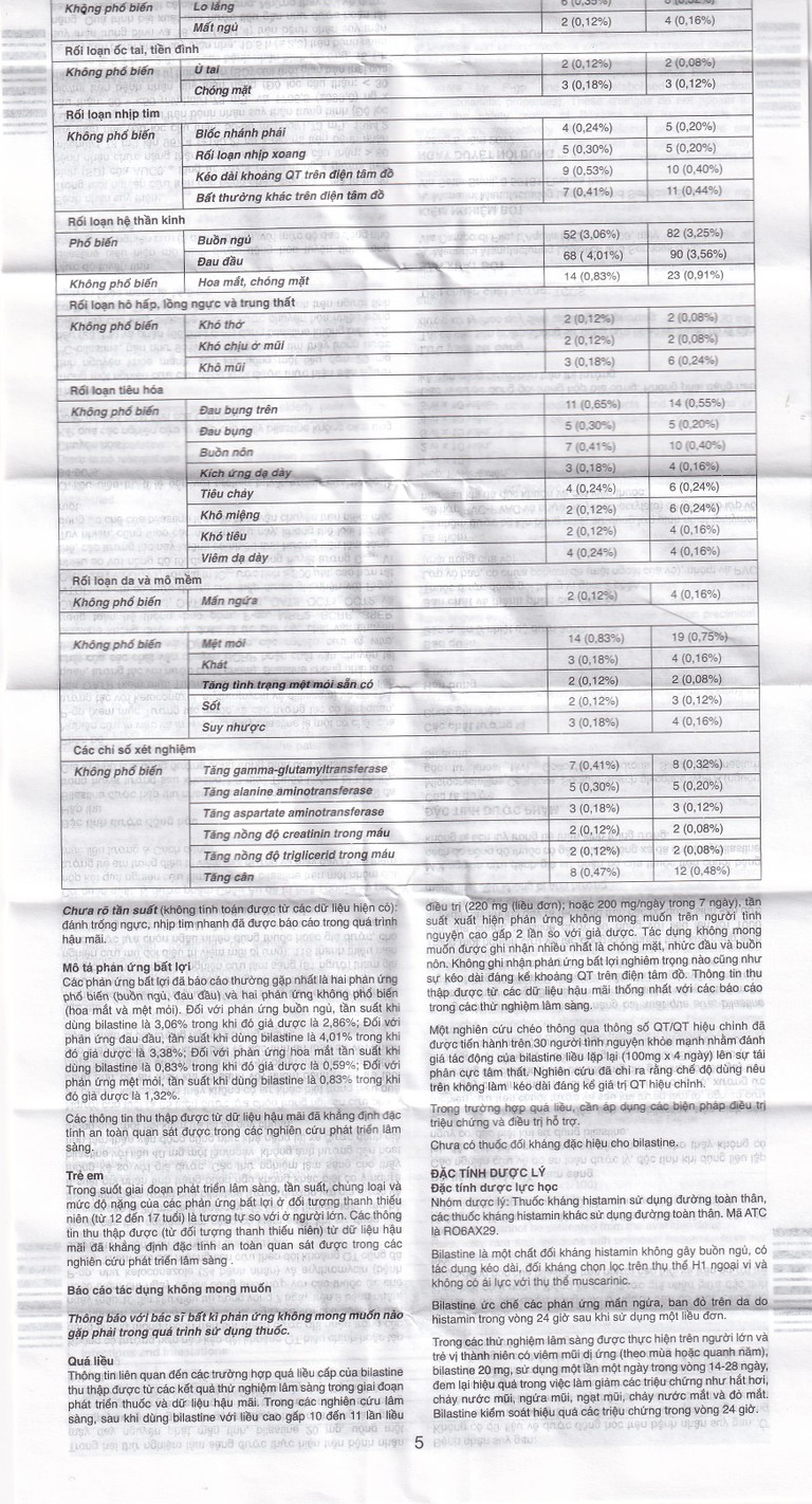 Các thử nghiệm lâm sàng pha II và pha III được tiến hành trong giai đoạn phát triển lâm sàng trên 2525 bệnh nhân điều trị với các là cha của Bilastine, trong đó có 1697 bệnh nhân dùng List = 2 ng. Trong các thử nghiệm này có 1362 bệnh nhân dùng giả dược. Các phản ứng bất lợi của thuốc (ADRs) thường ghi nhận được trên bệnh nhân sử dụng Bilastine 20 mg để điều trị viêm mũi dị ứng và mày đay tự phát mạn tính là đau đầu, buồn ngủ, chóng mặt và mệt mỏi. Các phản ứng này xuất hiện với tần suất tương tự với tần suất ghi nhận được trên bệnh nhân sử dụng giả dược.