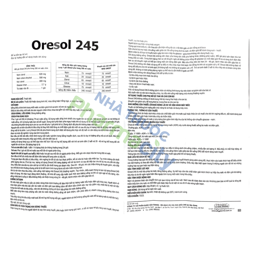 - Thuốc Oresol được sản xuất bởi Công Ty Cổ Phần Dược Hậu Giang, có thành phần bao gồm: Natri clorid, Natri citrat dihydrat, Kali clorid, Glucose khan, được chỉ định để điều trị mất nước do tiêu chảy ở trẻ em và người lớn.