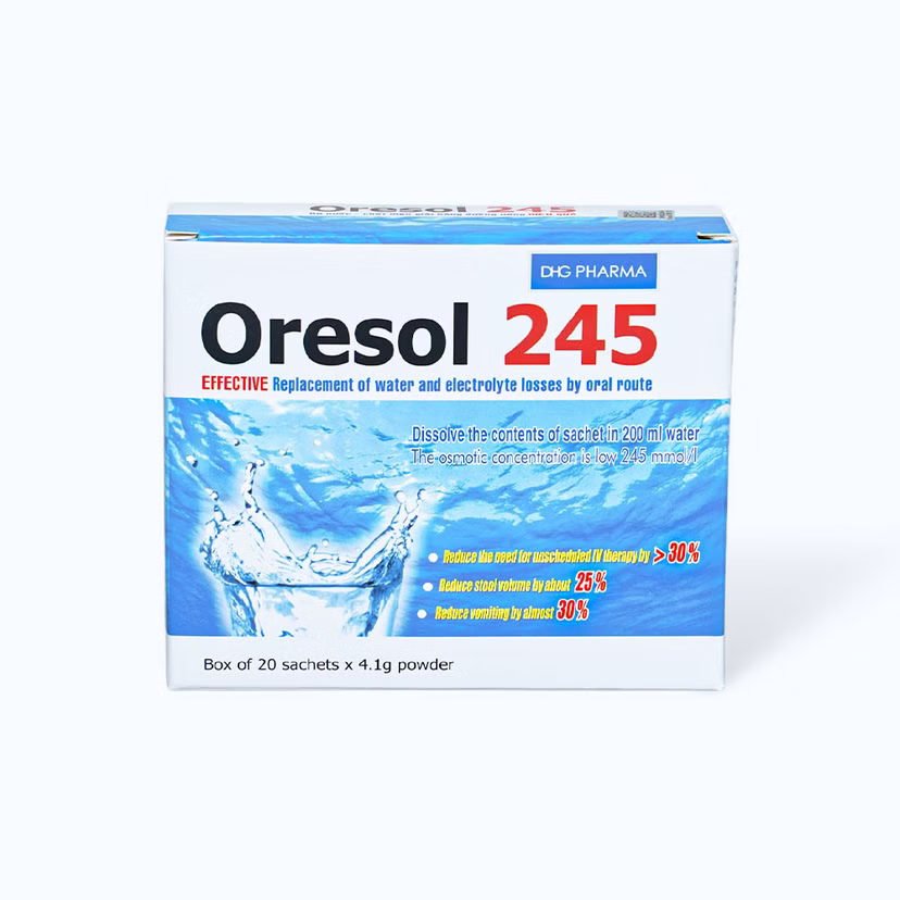 Oresol 245 là dung dịch bù nước và chất điện giải có nồng độ thẩm thấu thấp theo khuyến cáo mới nhất của Tổ chức y tế thế giới (WHO) được dùng trong điều trị các trường hợp mất nước.
