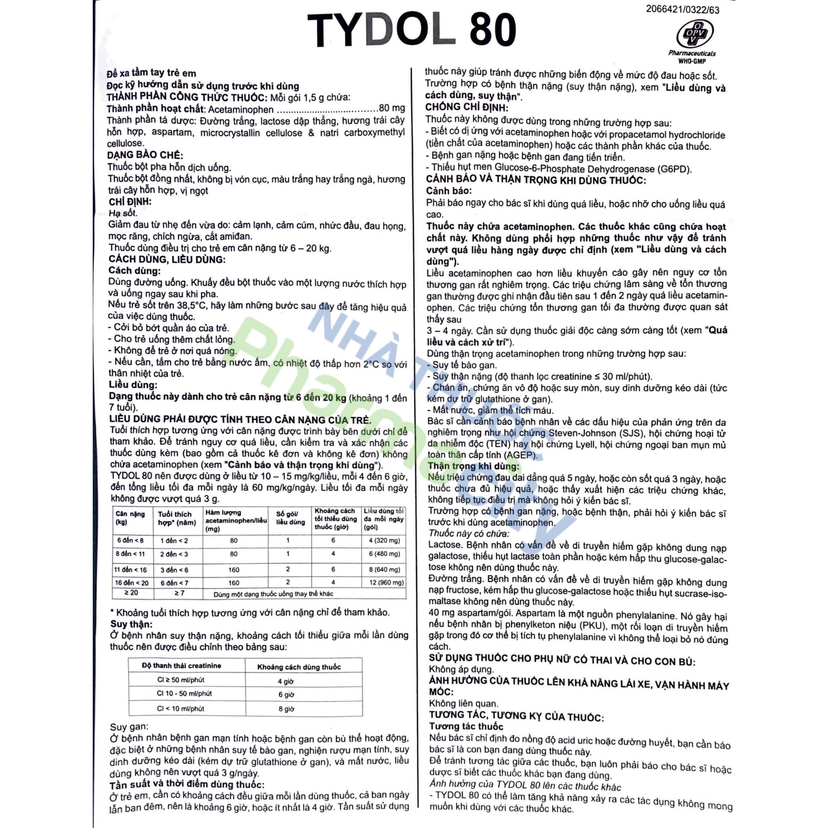 Tydol 80 mg là thuốc bột pha uống dùng để giảm đau và hạ sốt, phù hợp với trẻ em. Thuốc có hương vị giúp trẻ dễ uống hơn.