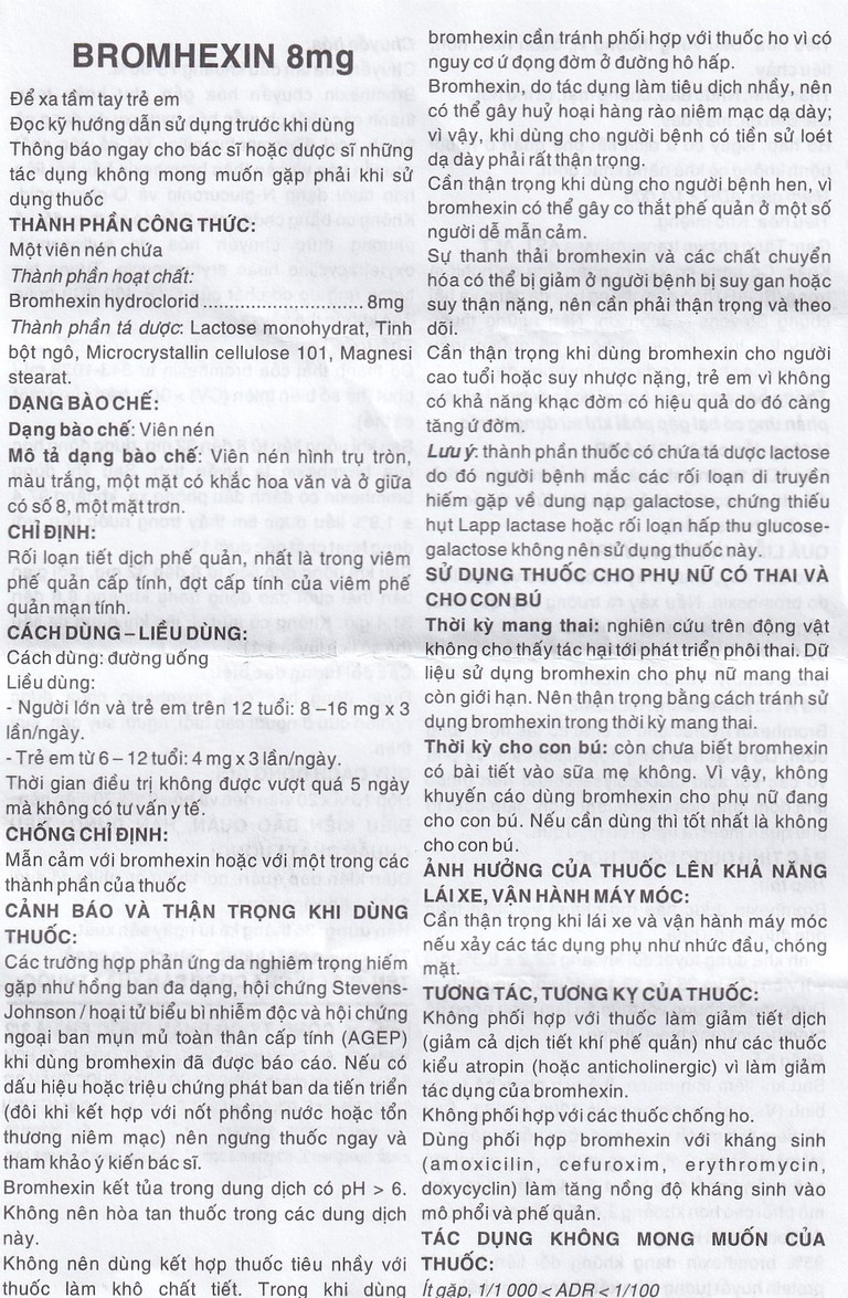 Liều dùng Bromhexin thông thường cho người lớn và trẻ em trên 10 tuổi: Uống mỗi lần 1 viên, ngày 3 lần.