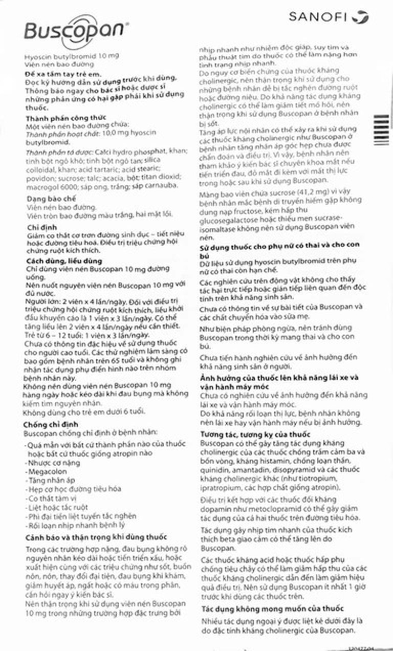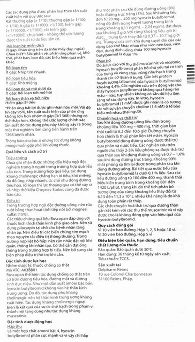 Nhiều tác dụng ngoại ý được liệt kê dưới đây là do đặc tính kháng cholinergic của Buscopan. Tác dụng phụ kháng cholinergic của Buscopan nhìn chung nhẹ và tự khỏi.