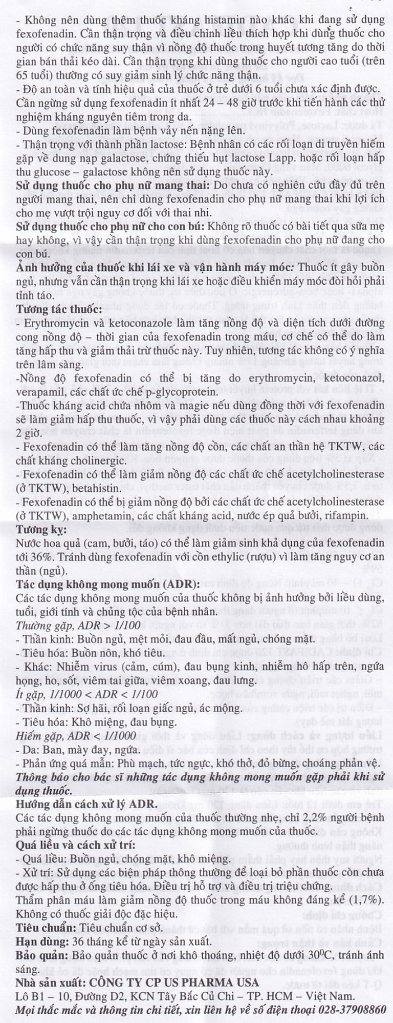 Độ an toàn và tính hiệu quả của thuốc ở trẻ dưới 6 tuổi chưa xác định được. Cần ngừng sử dụng Fexofenadin ít nhất 24 – 48 giờ trước khi tiến hành các thử nghiệm kháng nguyên tiêm trong da.