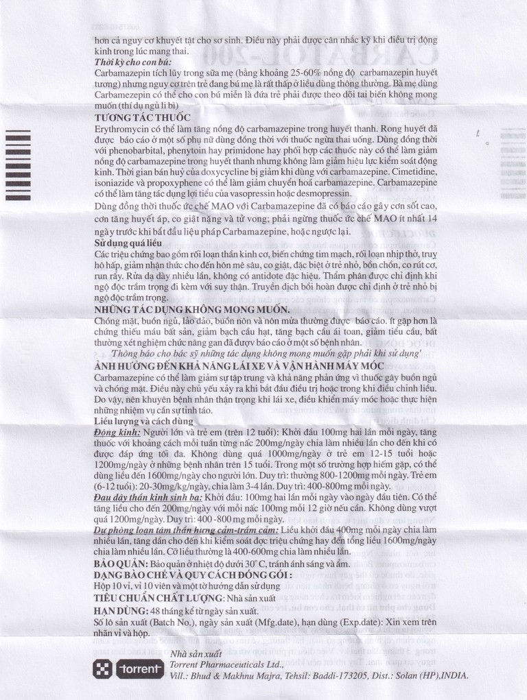 Thuốc Carbatol 200 Torrent điều trị bệnh động kinh cục bộ (10 vỉ x 10 viên)