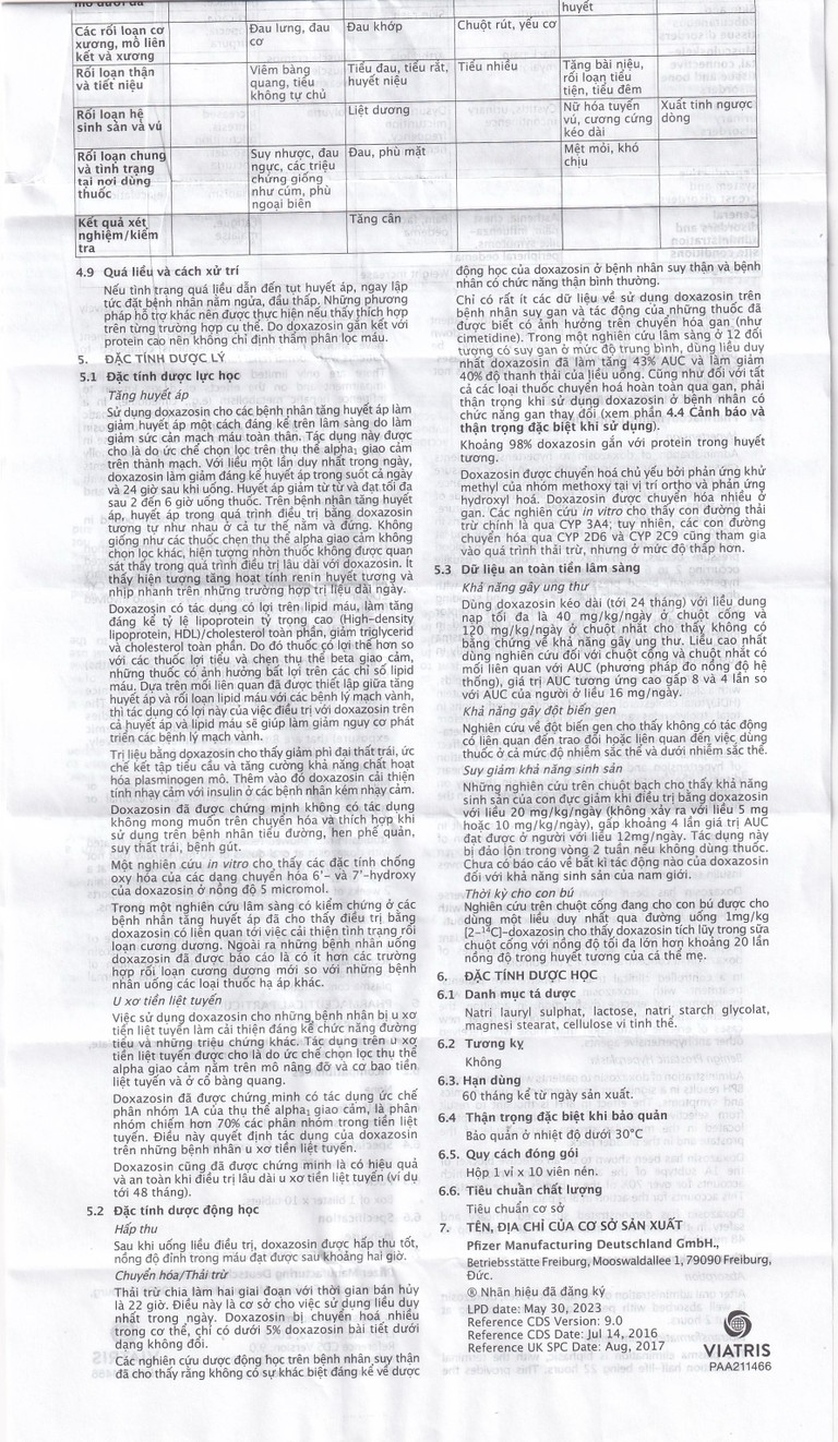 Các tác dụng không mong muốn bổ sung sau đây đã được báo cáo sau khi thuốc được đưa ra thị trường trên bệnh nhân được điều trị tăng huyết áp, nhưng nói chung không thể phân biệt được các tác dụng không mong muốn này với những triệu chứng có thể gặp ở những bệnh nhân tăng huyết áp khi không dùng doxazosin: Nhịp chậm, nhịp nhanh, đánh trống ngực, đau ngực, cơn đau thắt ngực, nhồi máu cơ tim, tai biến mạch máu não, loạn nhịp tim.