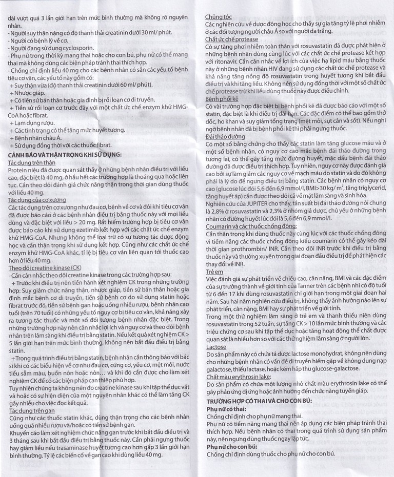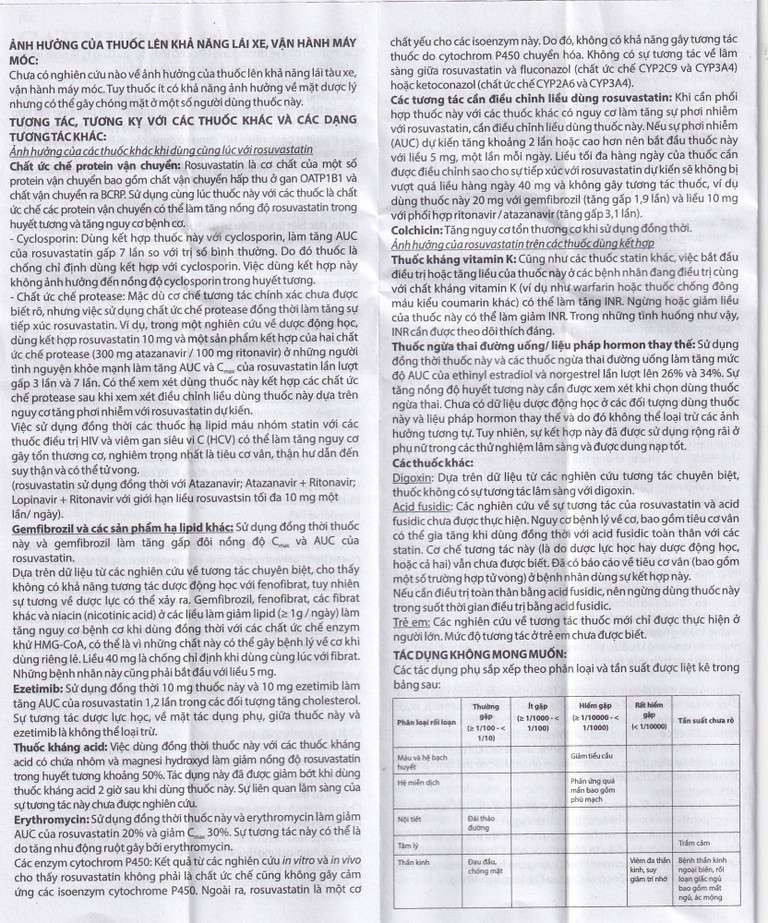 Acid fusidic: Các nghiên cứu về sự tương tác của rosuvastatin và acid fusidic chưa được thực hiện. Nguy cơ bệnh lý về cơ, bao gồm tiêu cơ vân có thể gia tăng khi dùng đồng thời với acid fusidic toàn thân với các statin. Cơ chế tương tác này (là do dược lực học hay dược động học, hoặc cả hai) vẫn chưa được biết. Đã có báo cáo về tiêu cơ vân (bao gồm một số trường hợp tử vong) ở bệnh nhân dùng sự kết hợp này. Nếu cần điều trị toàn thân bằng acid fusidic, nên ngừng dùng thuốc này trong suốt thời gian điều trị bằng acid fusidic.