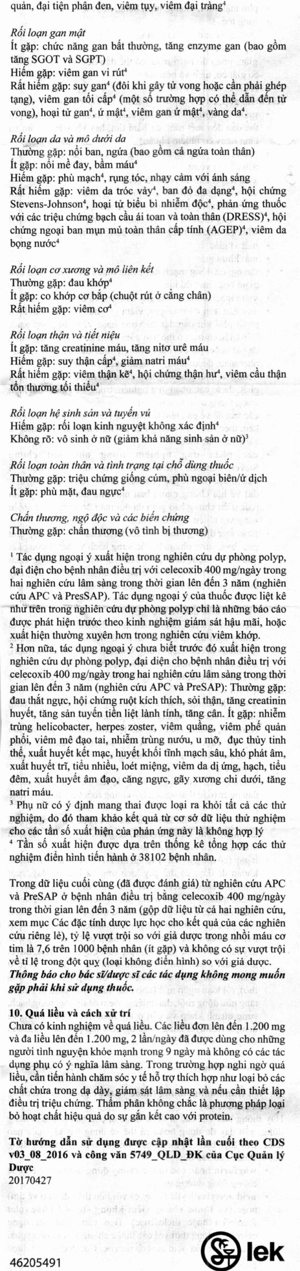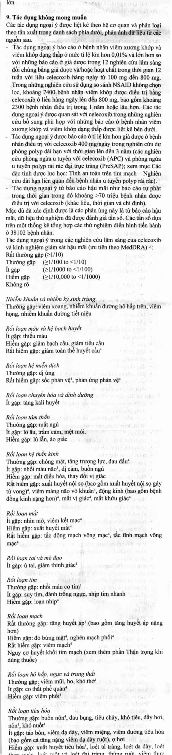 Tương tự các NSAID khác (như ibuprofen hoặc diclofenac), thuốc này có thể dẫn đến tăng huyết áp và do đó, có thể yêu cầu bạn kiểm tra huyết áp thường xuyên. Một số trường hợp gặp phản ứng nghiêm trọng trên gan, bao gồm viêm gan nặng, tổn thương gan, suy gan (một số trường hợp gây tử vong hoặc cần phải ghép gan) đã được ghi nhận với celecoxib.
