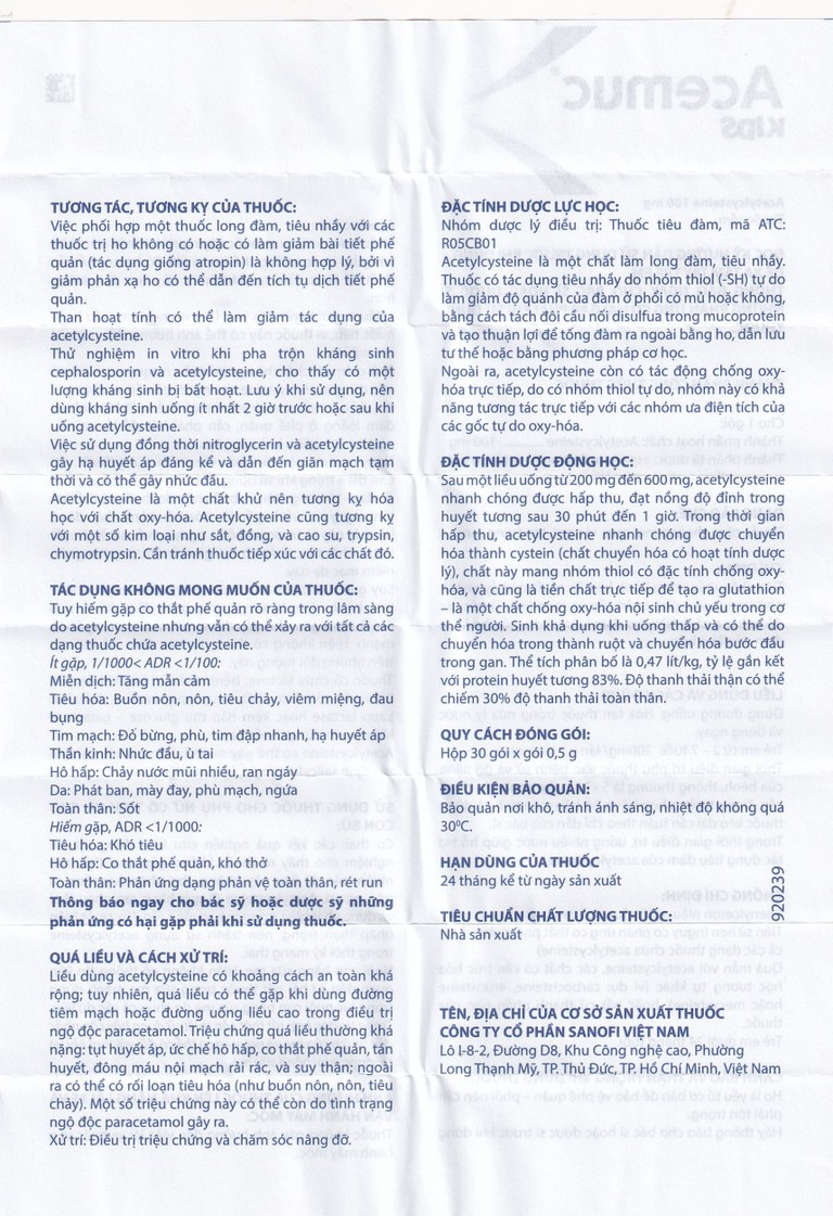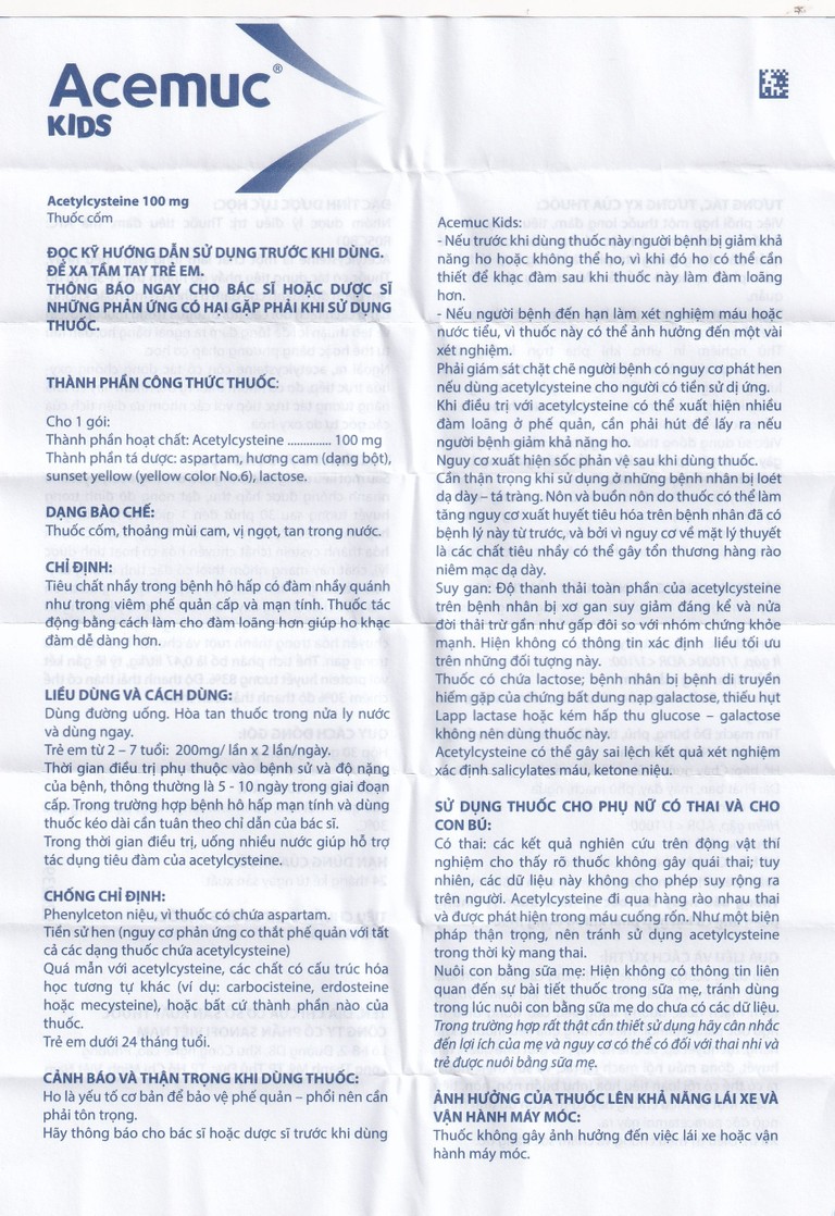 - Chống chỉ định: Không dùng thuốc cho trẻ em dưới 24 tháng tuổi, người mắc phenylceton niệu do thuốc có chứa aspartam, người có tiền sử hen do nguy cơ co thắt phế quản với acetylcystein, cũng như những trường hợp quá mẫn với acetylcystein, các chất có cấu trúc hóa học tương tự như carbocistein, erdosteine, mecysteine, hoặc bất kỳ thành phần nào của thuốc.