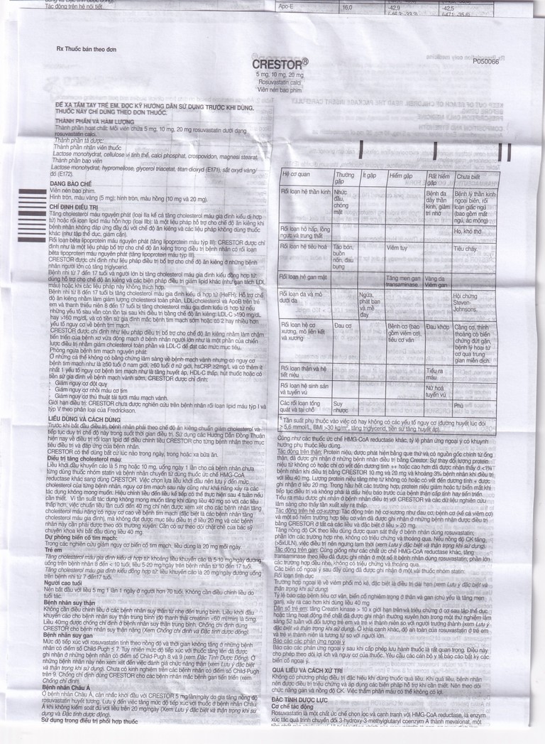Ảnh hưởng trên cơ xương: Các tác dụng trên cơ xương như đau cơ, bệnh cơ và hiếm hơn là tiêu cơ vân đã được báo cáo ở những bệnh nhân được điều trị bằng Crestor với tất cả các liều và đặc biệt với liều > 20 mg.