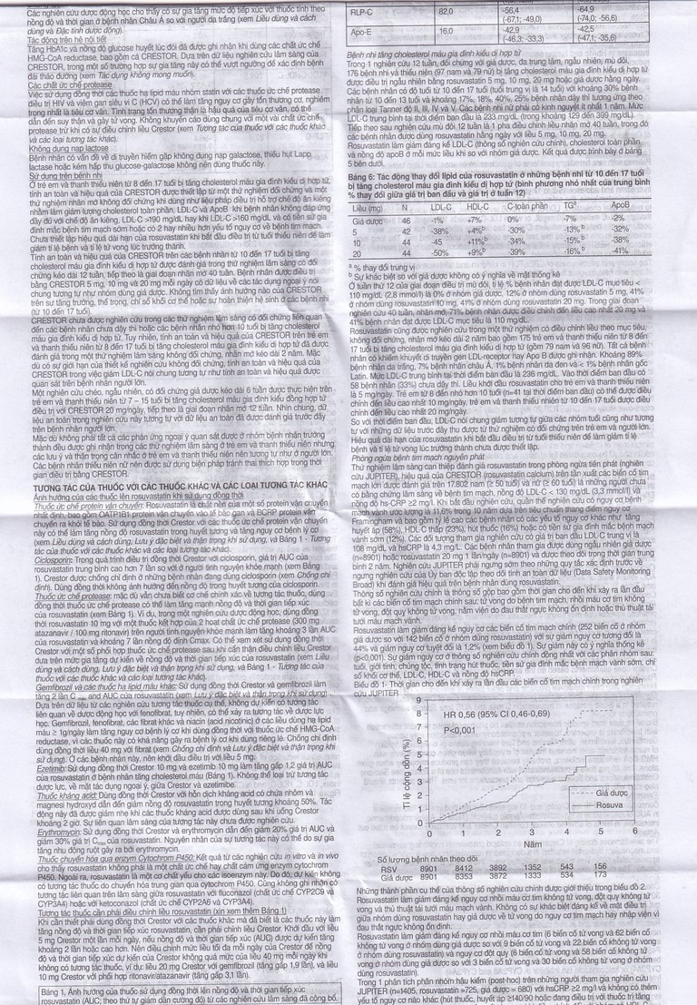• Trong khi điều trị: Khi có các biểu hiện đau cơ, cứng cơ, yếu cơ hoặc vọp bẻ không giải thích được, đặc biệt nếu có kèm mệt mỏi, sốt, nước tiểu sẫm màu, buồn nôn hoặc nôn trong quá trình sử dụng thuốc bệnh nhân cần làm xét nghiệm CK để có các biện pháp can thiệp phù hợp. Nên ngưng dùng Crestor nếu nồng độ CK tăng cao đáng kể (> 5x ULN) hoặc các triệu chứng về cơ trầm trọng và gây khó chịu hằng ngày. Nếu các triệu chứng này không còn nữa và nồng độ CK trở lại mức bình thường nên xem xét đến việc dùng lại Crestor hoặc dùng một chất ức chế HMG – CoA reductase khác ở liều thấp nhất và theo dõi chặt chẽ.