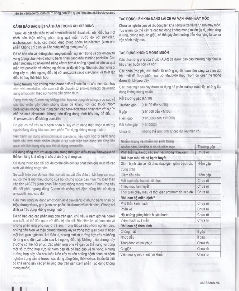 Sự xuất hiện ban đỏ toàn thân có sốt lúc bắt đầu điều trị kết hợp với mụn mủ có thể là một triệu chứng của hội chứng ngoại ban mụn mủ toàn thân cấp tính (AGEP). Phản ứng này đòi hỏi phải ngưng dùng Curam và chống chỉ định dùng bất cứ dạng amoxicillin nào sau đó.