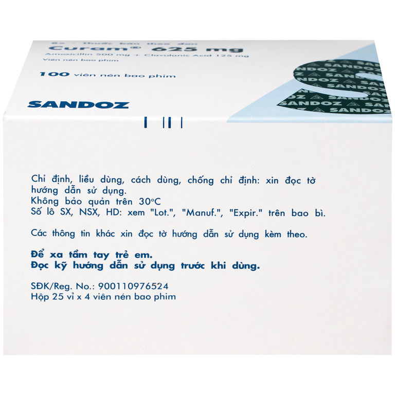 Thuốc Curam 625mg Sandoz điều trị nhiễm khuẩn do các vi khuẩn nhạy cảm (25 vỉ x 4 viên)