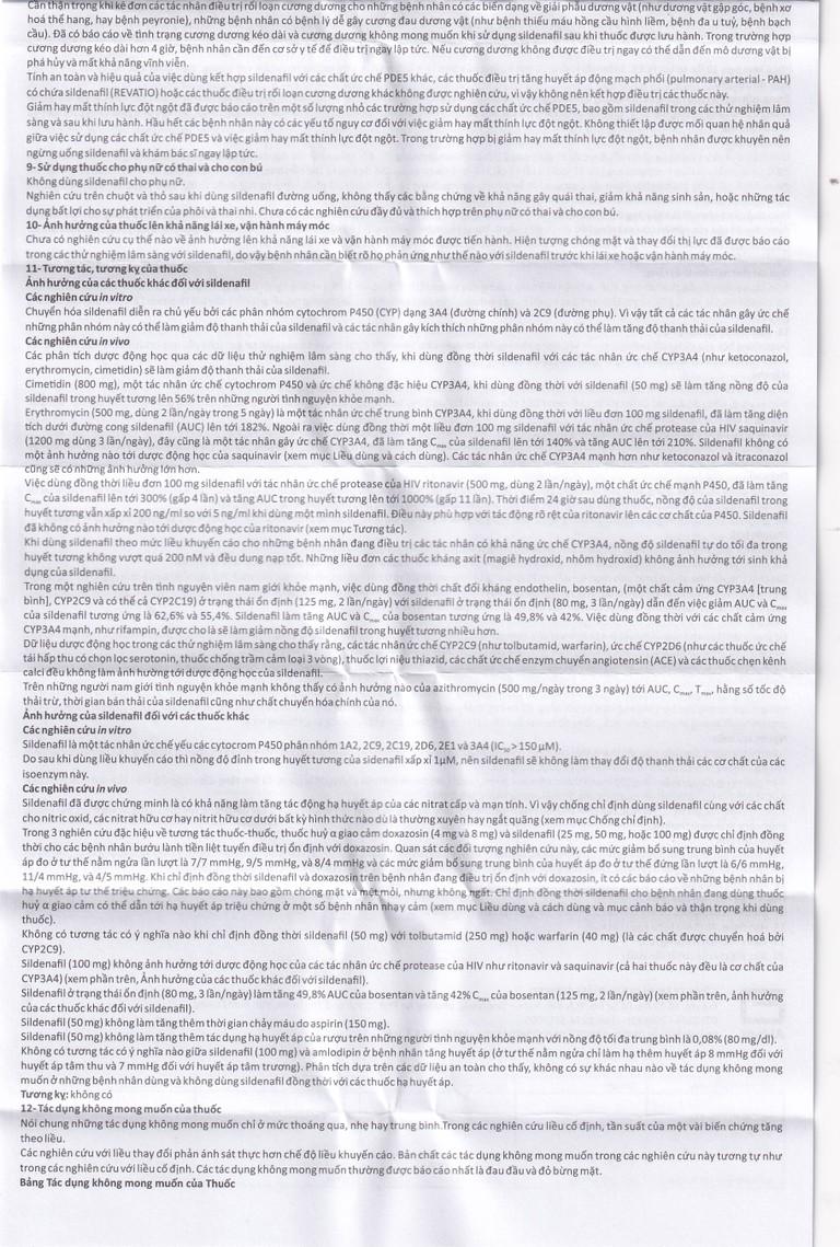 Người đang dùng các thuốc khác: Liều khởi đầu không quá 25mg/ngày nếu đang dùng sildenafil với thuốc ức chế enzym cytochrom P450 3A4; không dùng quá 25mg mỗi 48 giờ khi dùng chung với ritonavir; liều khởi đầu 25mg nên được cân nhắc ở bệnh nhân được ổn định với thuốc chẹn alpha. Không nên dùng liều cao hơn trong vòng 4 giờ dùng thuốc chẹn alpha do nguy cơ hạ huyết áp triệu chứng.