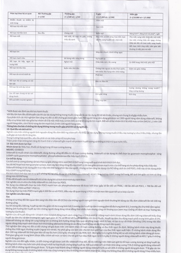 Xử trí: Trong trường hợp quá liều, cần áp dụng những biện pháp hỗ trợ chuẩn. Vì sildenafil gắn kết cao với protein huyết tương và không bị thải trừ trong nước tiểu, thẩm phân thận không làm tăng độ thanh thải của thuốc.