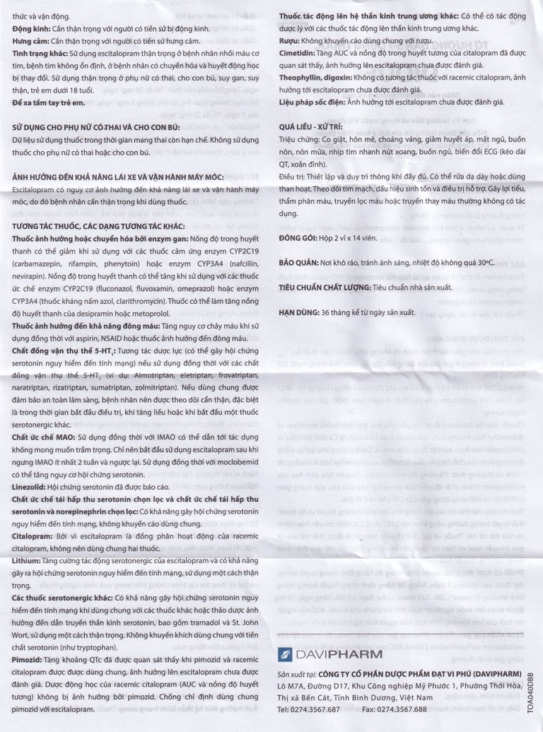 Lithium: Tăng cường tác động serotonergic của escitalopram và có thể gây hội chứng serotonin. Thận trọng khi sử dụng.