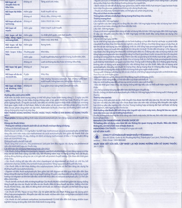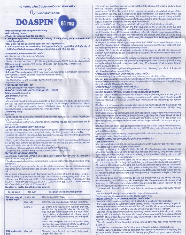 - Dùng liều > 100 mg/ngày trong ba tháng cuối của thời kỳ mang thai. Dùng đồng thời DOASPIN 81 mg với methotrexat (ở liều > 15 mg/tuần).