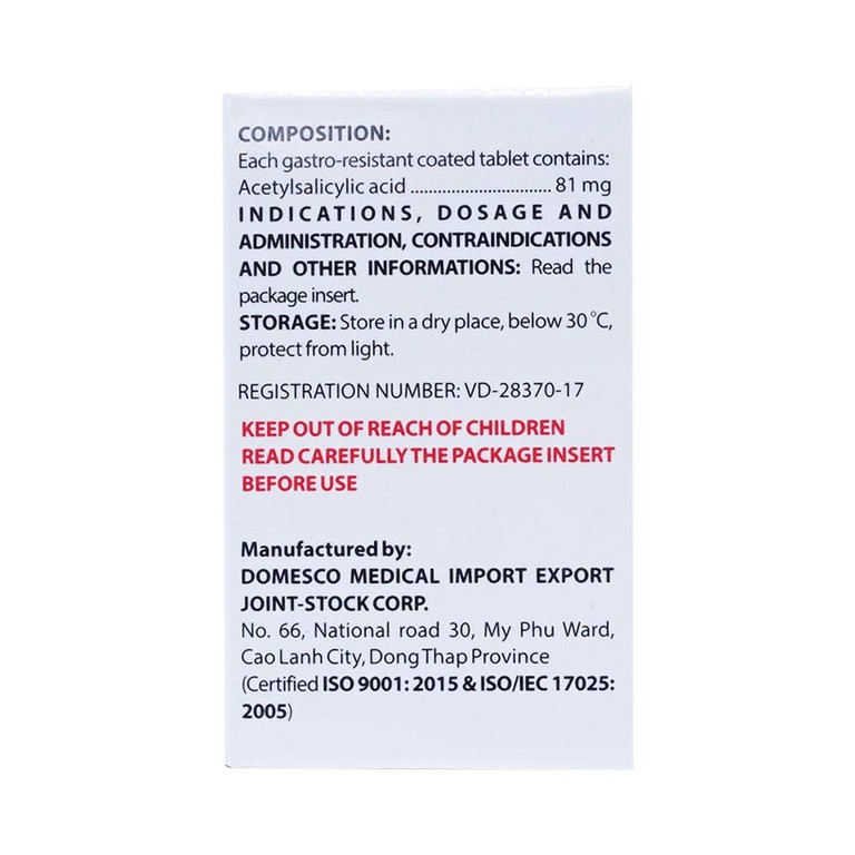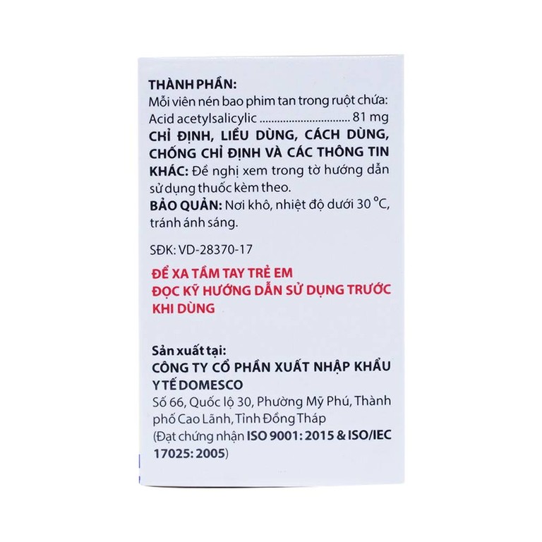 Thuốc Doaspin 81mg Domesco dự phòng huyết khối tim mạch và mạch não (100 viên)