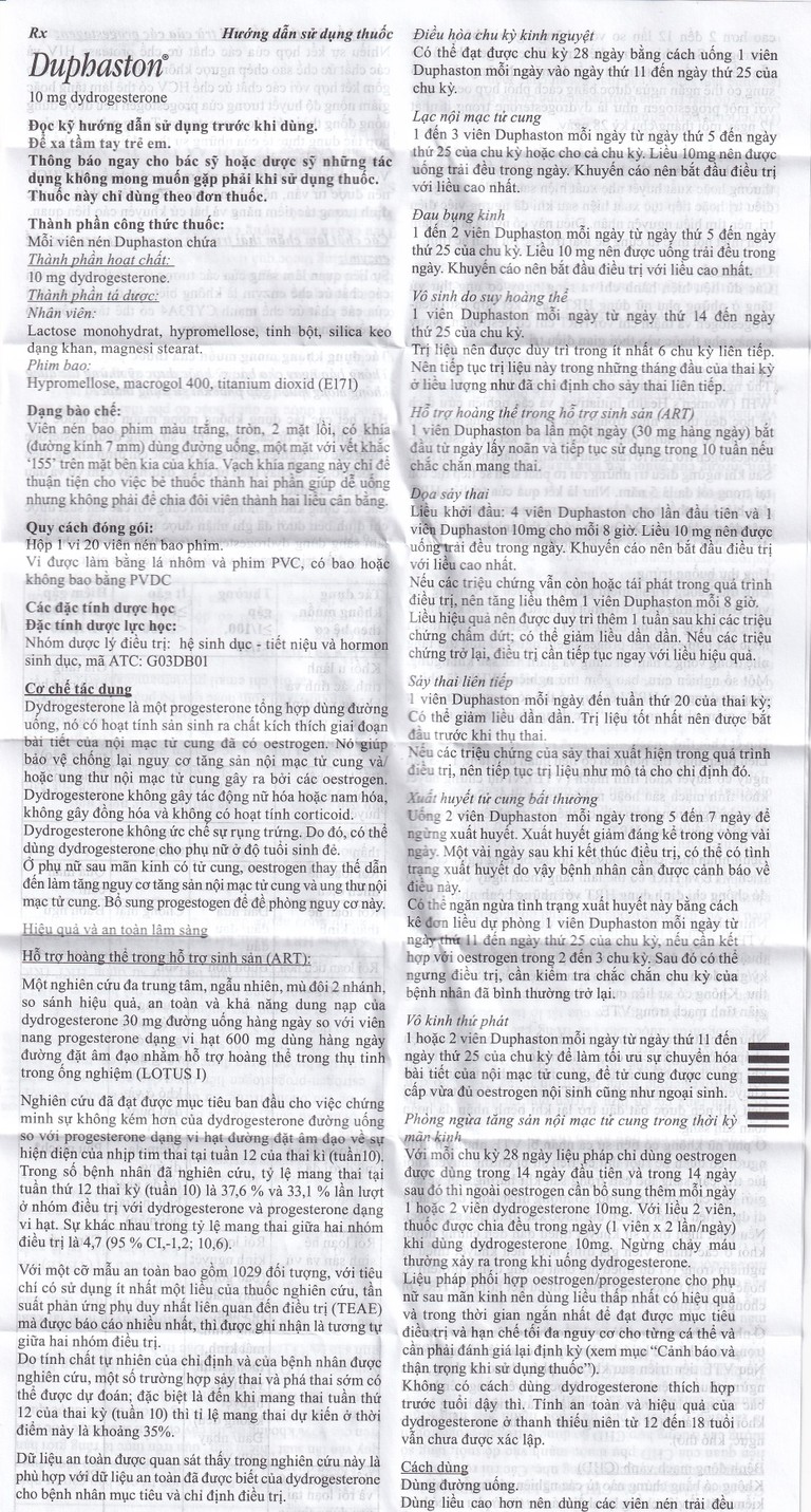1 hoặc 2 viên Duphaston mỗi ngày từ ngày thứ 11 đến ngày thứ 25 của chu kỳ để làm tối ưu sự chuyển hóa bài tiết của nội mạc tử cung, để tử cung được cung cấp vừa đủ oestrogen nội sinh cũng như ngoại sinh.