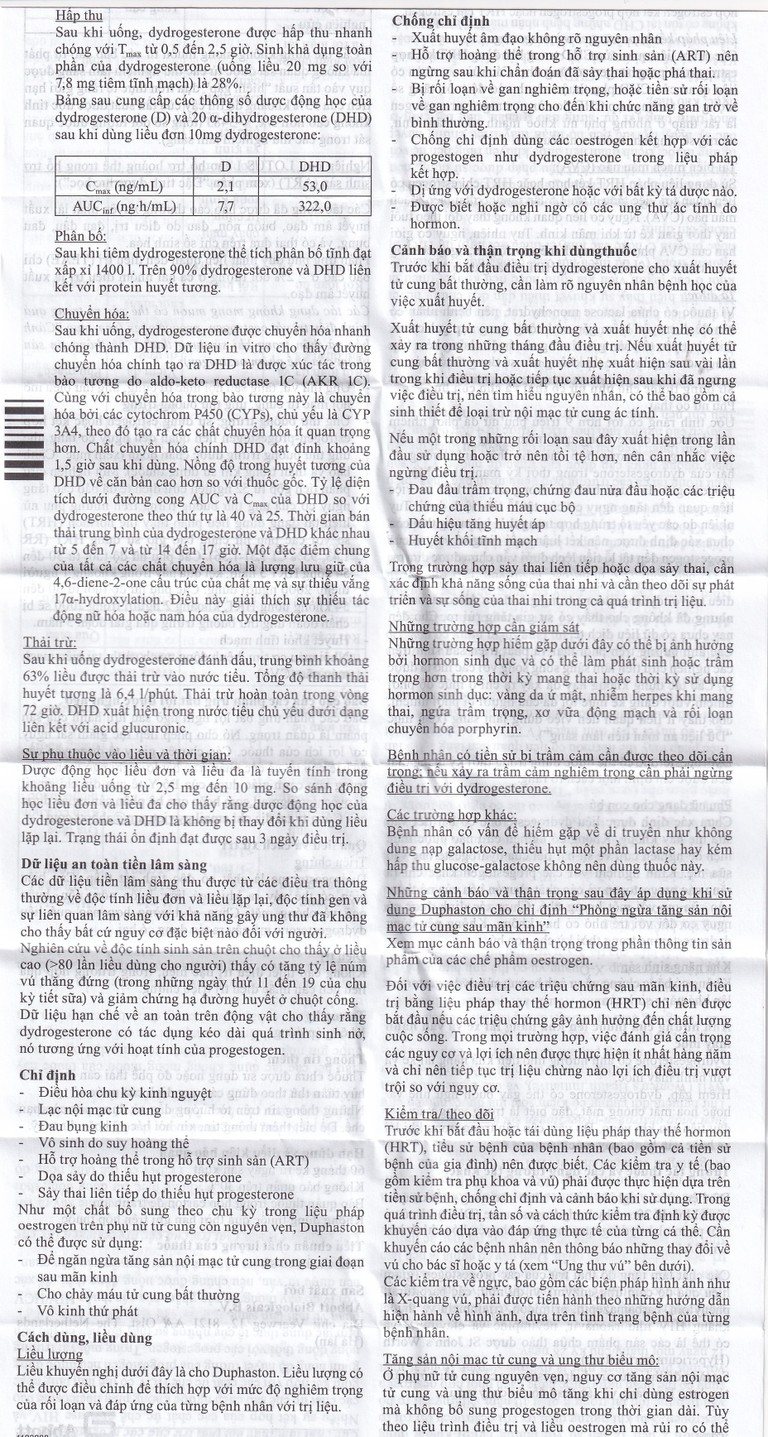Sau khi uống, dydrogesterone được hấp thu nhanh chóng với Tmax từ 0,5 đến 2,5 giờ. Sinh khả dụng toàn phần của dydrogesterone (uống liều 20 mg so với 7.8 mg tiêm tĩnh mạch) là 28%.