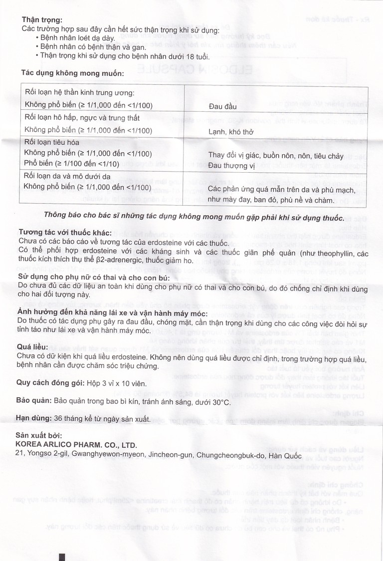Thuốc Eldosin Capsule Arlico loãng đờm trong bệnh hô hấp cấp và mạn tính (3 vỉ x 10 viên)