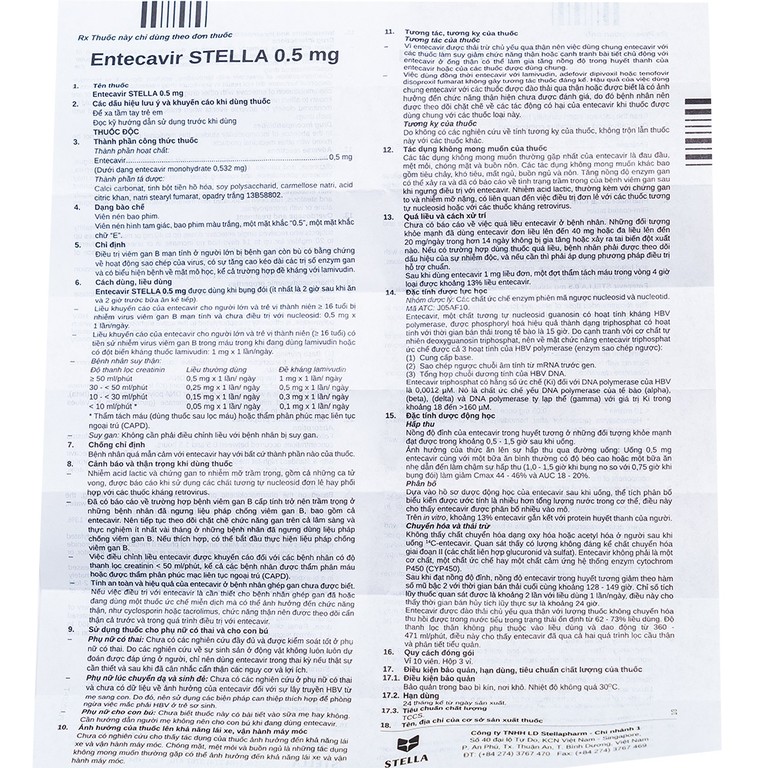 Thuốc Entecavir Stella 0.5mg điều trị viêm gan B mạn tính (3 vỉ x 10 viên)