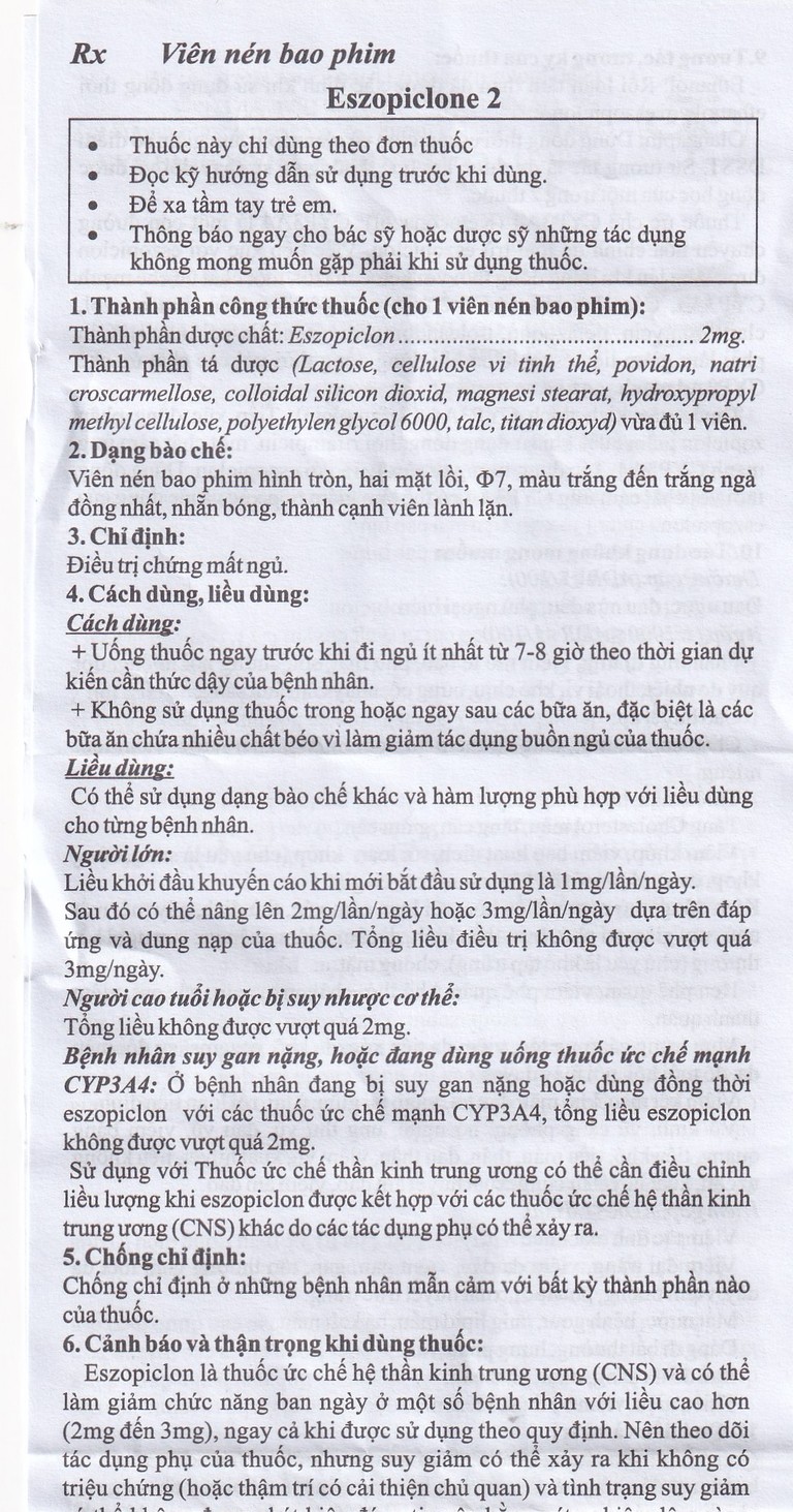 Bệnh nhân suy gan nặng, hoặc đang dùng uống thuốc ức chế mạnh CYP3A4: Ở bệnh nhân đang bị suy gan nặng hoặc dùng đồng thời eszopiclon với các thuốc ức chế mạnh CYP3A4, tổng liều eszopiclon không được vượt quá 2mg.